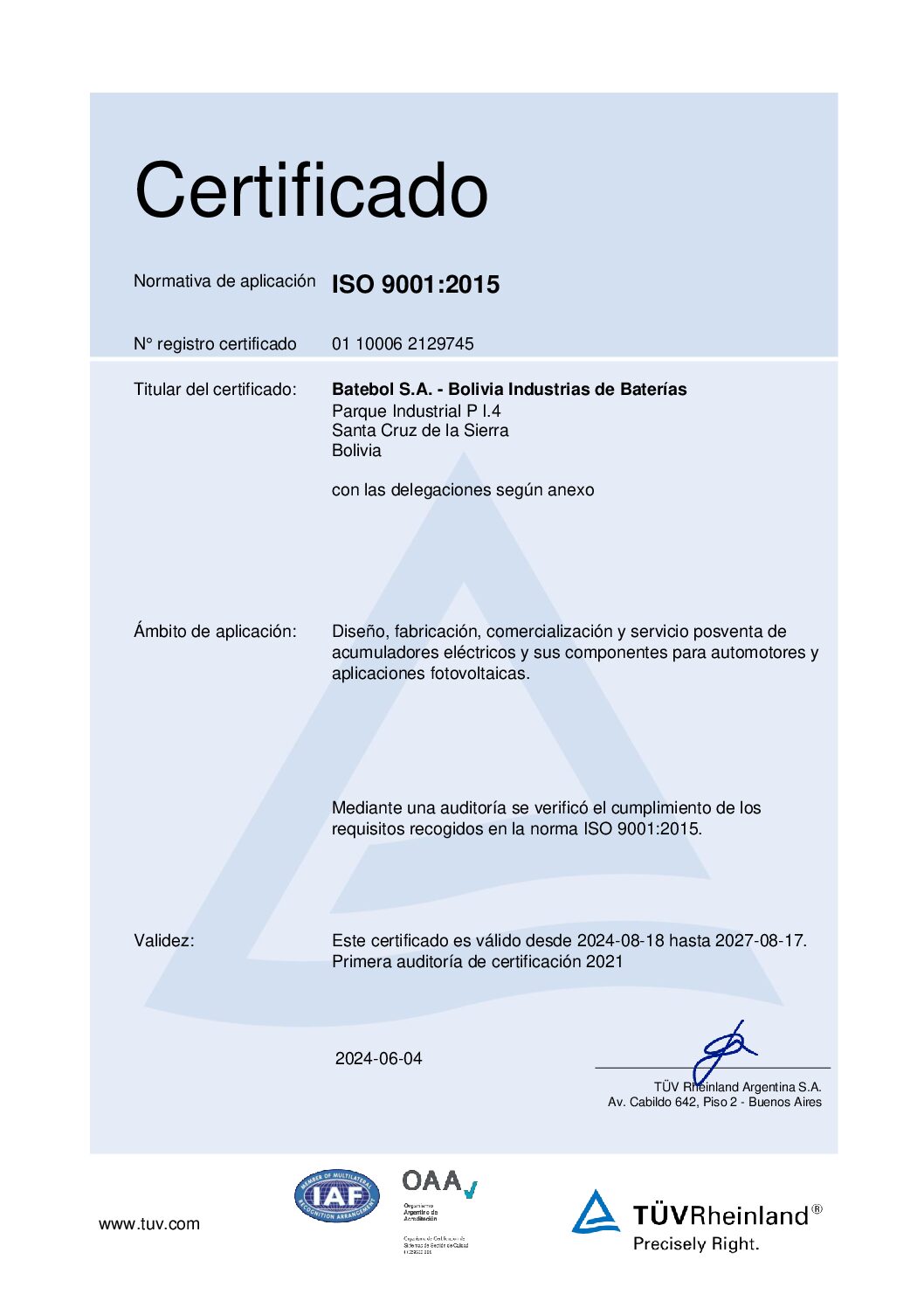 Desde hace más de 20 años, el Sistema de Gestión de Calidad de BATEBOL SA cuenta con certificación ISO 9001 avalada por el organismo Internacional TÜV Rheinland, lo cual respalda nuestro compromiso con la calidad, y garantiza a nuestros Clientes la mejora continua de nuestros productos y servicios.